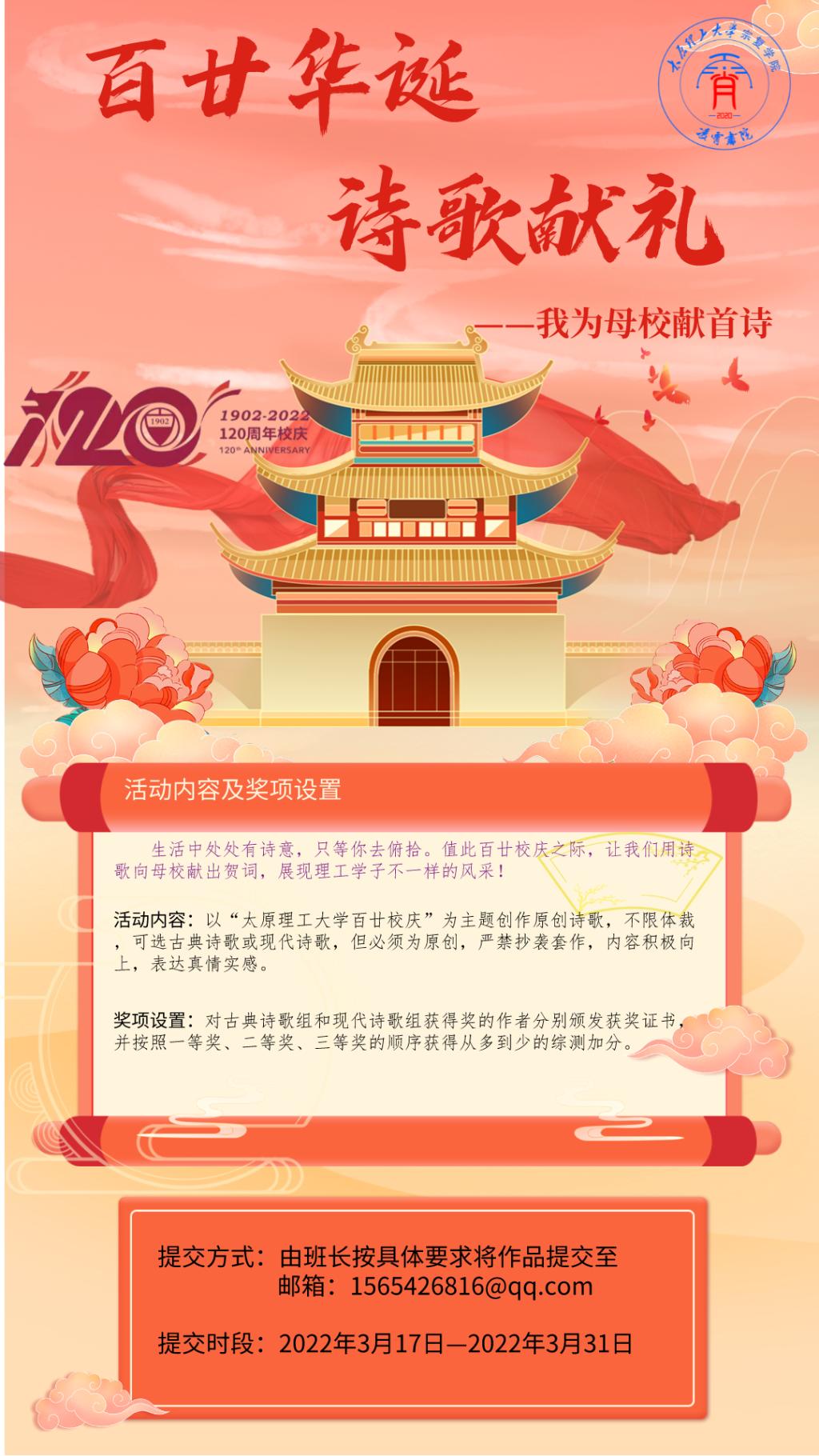 5.以班级为单位将作品于2022年3月31日前发送至邮箱1565426816@qq.com,每份作品备注创作者学号、姓名、联系方式(QQ号及手机号)及诗歌创作类型(古典诗歌和现代诗歌),班长将班级内所有作品以压缩包形式发送,文件以班级名命名。