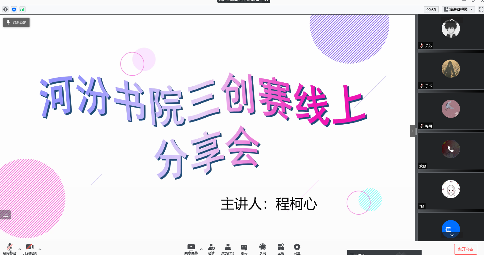 分享会上,程柯心同学从选题,赛前准备,项目计划书撰写等方面详细介绍,并且从自身经历向同学们展示了她们团队的获奖作品,讲述了团队如何进行分工以及如何完善项目,让同学们了解三创赛比赛的全过程,本次活动采用线上形式,同学们积极响应,踊跃发言。