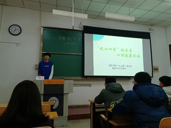为帮助同学们更好适应大学生活,有效处理生活中的人际关系,保持良好的心理状态,11月20号下午2点半,由晋阳书院“心之翼”俱乐部主办的的“悦心四季”心理健康主题观影活动在行知楼B114开展。本次活动对象面向晋阳书院全体心理委员以及感兴趣的同学。