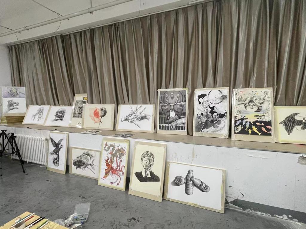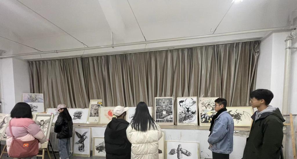 展出过程中,同学们一起交流讨论。画作的作者们向前来参观的同学们分享自己作画时的经历和想法,同时指出自己绘画时仍有所欠缺的地方。在他们欣赏彼此作品的同时,也增进了同学之间的感情,提升了专业能力。在展览过程中,美术老师也参与到讨论之中,为每一位同学的作品进行评价指导,使同学们学有所获,并解决了一些专业问题。