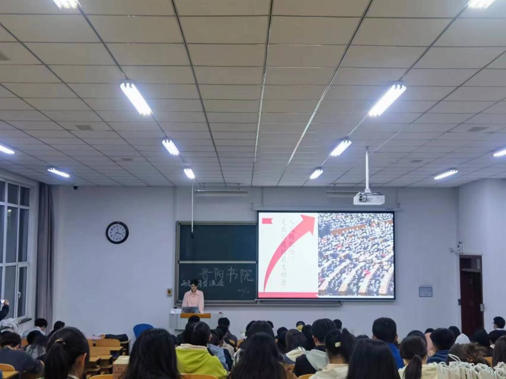 “喧鸟覆春洲,杂英满芳甸”,全国两会在绚丽烂漫、花香鸟语的阳春三月拉开序幕。为深入推进两会相关知识的普及,学习弘扬两会精神,3月19日晚晋阳书院团委、学生会在行思楼B321开展了异彩纷呈、振奋人心的两会专题学习交流会。晋阳书院团委、学生会代表霍昕恬对两会相关内容进行宣讲。为有效调动同学们的积极性,霍昕恬采取知识问答的形式讲述两会内容,并与在场同学深入热烈地探讨对两会内容的理解。在场的同学们踊跃发言、各抒己见,充分展现了晋阳书院青年学子的责任感与使命感。