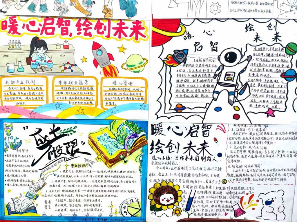 本次活动面向晋阳书院全体大一学生,以手抄报为创作载体,鼓励大家打破传统版式局限,融合绘画、书法、拼贴、创意排版等多元形式,聚焦未来大学生活学习愿景这一核心主题,勾勒心中的理想校园图景。活动一经启动得到了同学们的热烈响应,大家踊跃参与,精心创作出主题鲜明、形式新颖的手抄报作品。这些作品中,有的用明快色彩描绘着图书馆里的潜心研读、运动场中的肆意奔跑;有的用细腻文字写下对专业学习的钻研之志、对社团活动的向往之心;有的巧用手账材料进行立体拼贴,展现出天马行空的青春畅想。每一份手抄报都饱含着同学们对未来的期许与对生活的热爱,尽显蓬勃的青春活力。