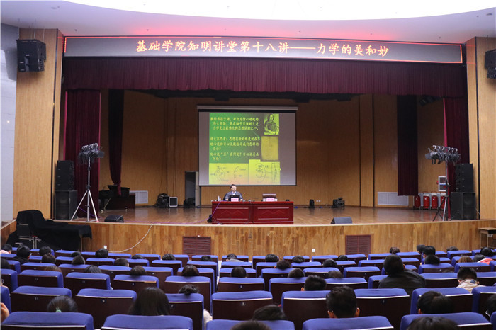 11月13日下午及晚上,清华大学殷雅俊教授做客“知明讲堂”,在明向校区学生活动中心进行第十七讲“从具象到抽象:科学与艺术的共同轨迹与归宿”、第十八讲“力学的美和妙”的讲座。此次活动由基础学院与物电学院联合举办,基础学院党总支书记张少临、院长宋燕、物电学院党委书记郭菲、院长郝玉英等以及1400余名学生参加了两场讲座。